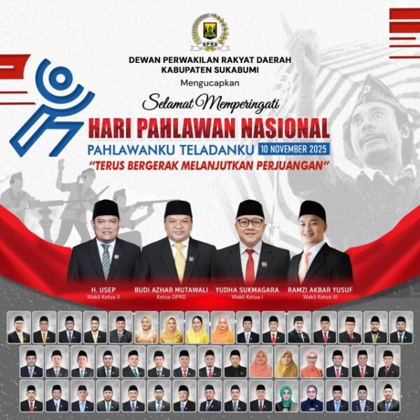 SUKABUMI – Keluarga Besar Dewan Perwakilan Rakyat Daerah (DPRD) Kabupaten Sukabumi menyampaikan ucapan selamat memperingati Hari Pahlawan yang jatuh pada 10 November 2025. Peringatan tahun ini mengusung tema “Pahlawanku Teladanku” Terus Bergerak Melanjutkan Perjuangan.”